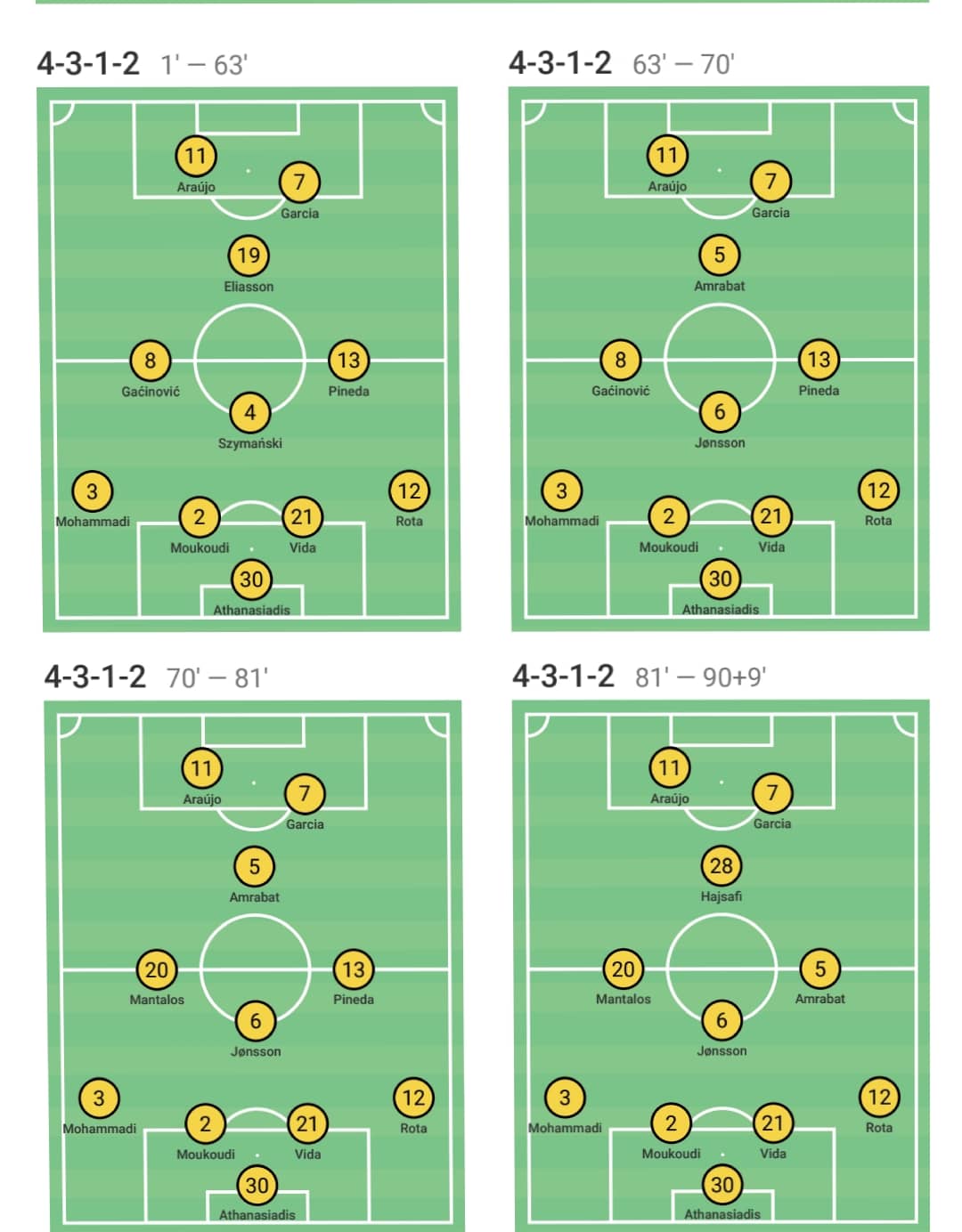 Ο Λιβάι Γκαρσία παίζει πλέον στην κορυφή της επίθεσης, ο Αραούχο θεωρητικά βρίσκεται πιο πίσω(μόνο εκεί δεν βρίσκεται), και στον χώρο του κέντρου ο Σιμάνσκι είναι το μόνο αμυντικό χαφ με τον Πινέδα ως all around play maker, τον Γκατσίνοβιτς να ξεκινάει τις προσπάθειες του από αριστερά συγκλίνοντας προς τον άξονα, και τον Ελίασον από δεξιά να παίζει περισσότερο σαν εξτρέμ πάνω στην γραμμή. Και φυσικά τα δύο μπακ να ξεκινάνε τις προσπάθειές τους από το μεσαίο τρίτο και να δίνουν αρκετές βοήθειες επιθετικά ανεβαίνοντας όλη την πλευρά.