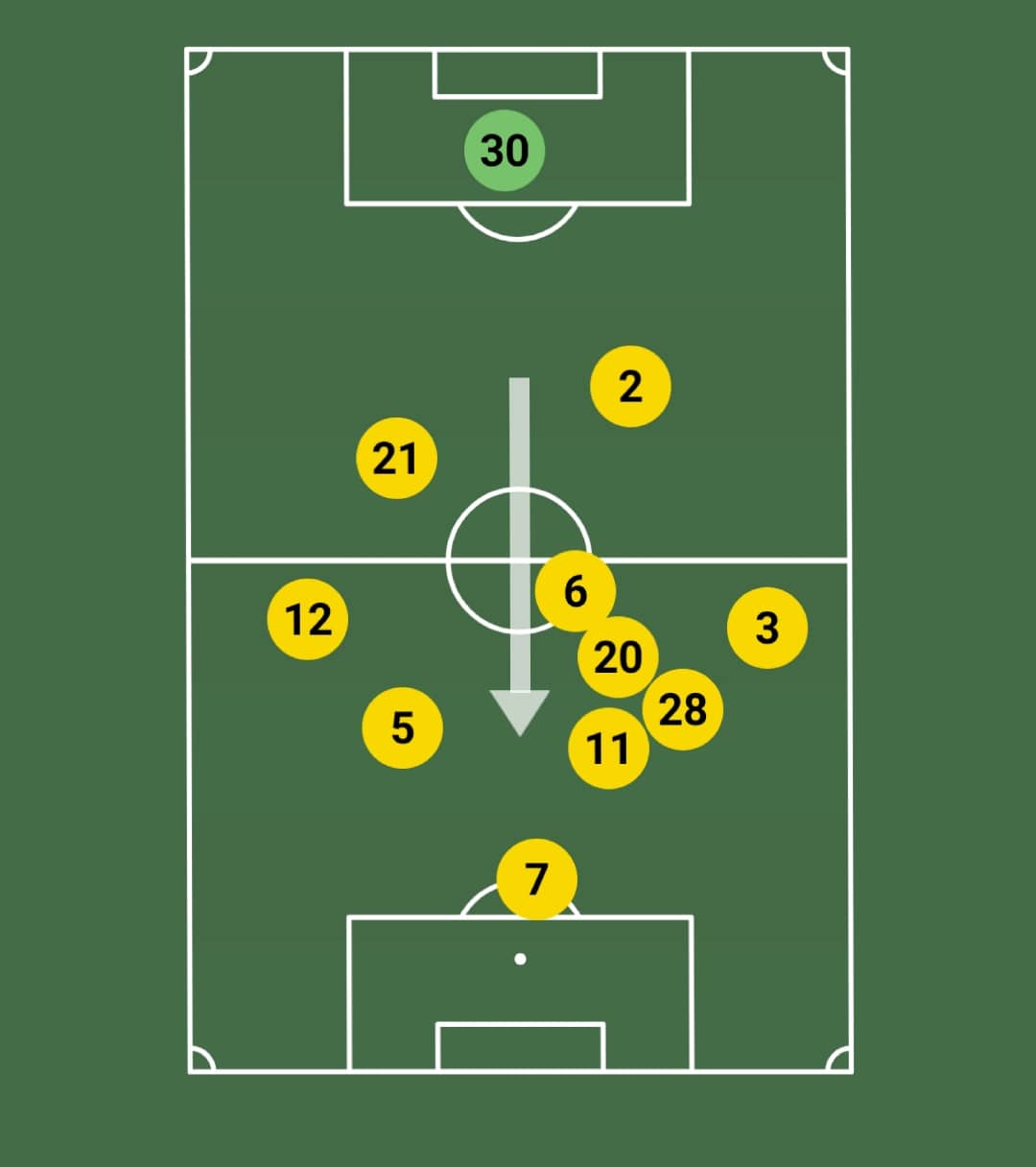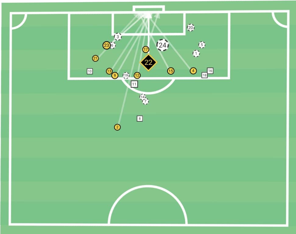 Μουκουντι – Βίντα – Σιμάνσκι – Μοχαμάντι – Πινέδα – Ρότα ήταν οι παίκτες που άλλαξαν μεταξύ τους τις περισσότερες πάσες στο παιχνίδι και από αυτούς ξεκινούσε και το χτίσιμο των επιθέσεων. Επίσης βλέπουμε πόσο ψηλά στο γήπεδο κινούνται ο Ρότα με τον Μοχαμάντι αλλά και τα δύο στοπερ ο Μουκουντί και κυρίως ο Βίντα που βρίσκονται σε φάση οργανωμένης επίθεσης.