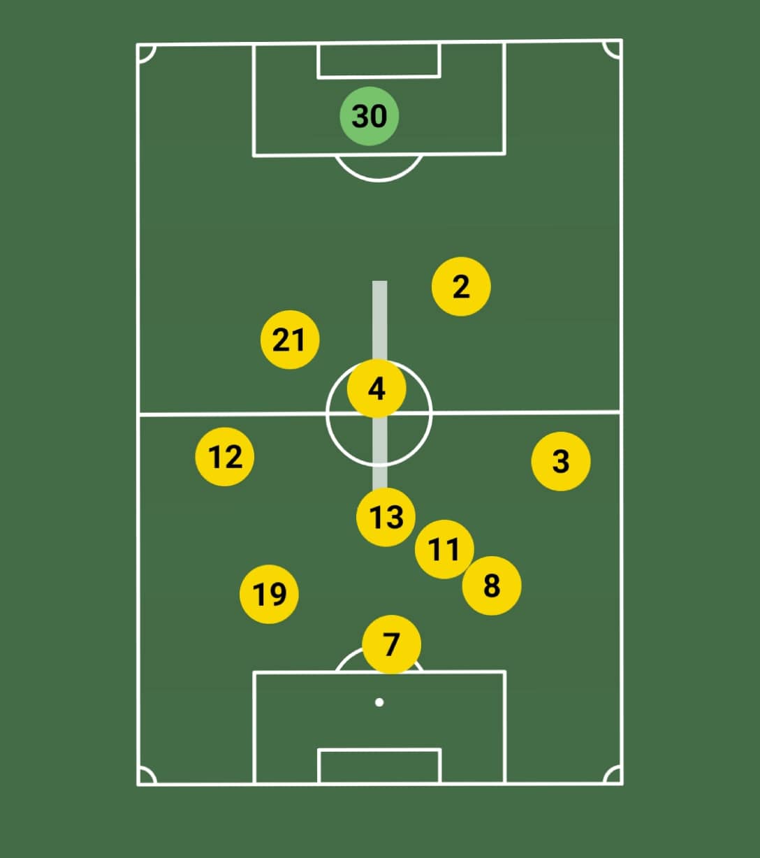 Από την προηγούμενη ανάλυση είχαμε πει ότι ο σχηματισμός της ΑΕΚ στο γήπεδο είναι κάτι σχετικό. Μικρή σημασία έχει αν ο σχηματισμός ήταν 4-4-2 η 4-3-1-2 όπως μας το δίνει η πλατφόρμα ανάλυσης wyscout, διότι η πραγματικότητα στο χορτάρι είναι διαφορετική. Είναι πάντως ο τρίτος συνεχόμενος αγώνας που ο Ματίας Αλμέιδα ξεκίνησε με τους ίδιους ακριβώς 11.