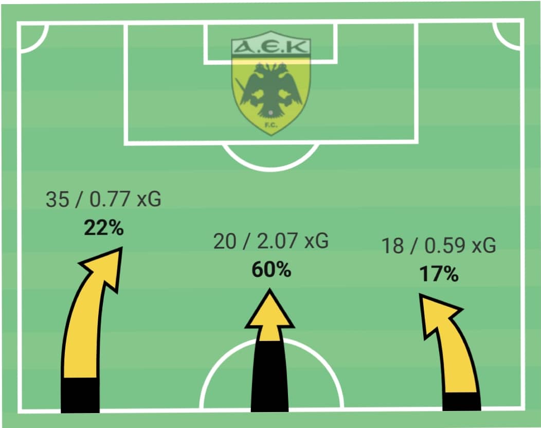 Συνηθίζει να κάνει τις πιο ποιοτικές επιθέσεις της από τον άξονα, και αυτό μας δείχνει το κάτω γράφημα και στον αγώνα με τον Ατρόμητο, ότι το 60% των x/G με 20 επιθέσεις είναι από τον άξονα και αν και στον συγκεκριμένο αγώνα ο Ατρόμητος είχε κλείσει καλά τους χώρους εκεί, παρόλα αυτά η ΑΕΚ ήταν και πάλι δημιουργική.