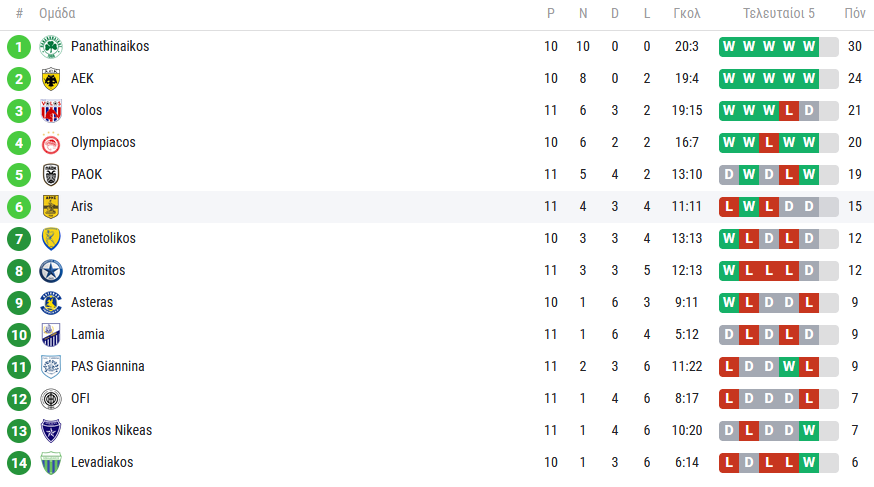 Μετά την πρώτη μέρα της 11ης αγωνιστικής της SuperLeague έτσι διαμορφώθηκε η βαθμολογία.