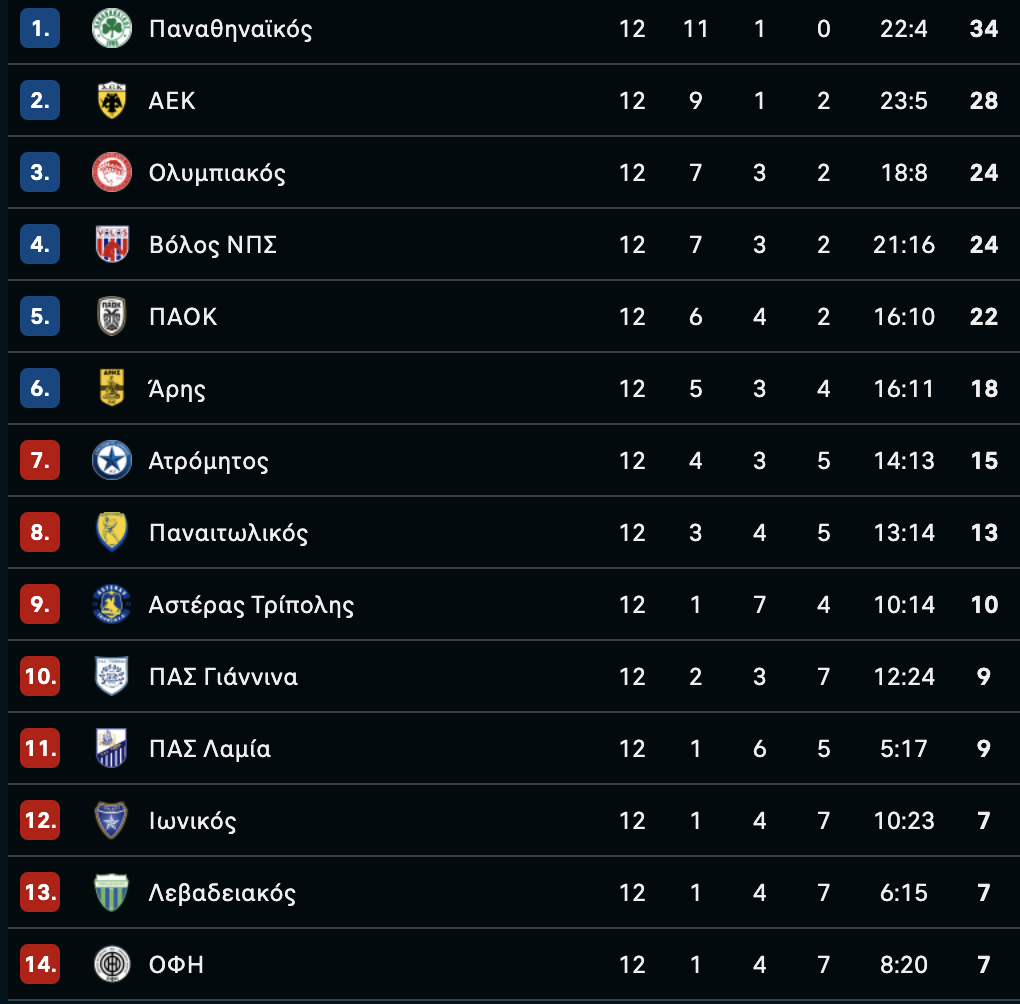 Δείτε πώς διαμορφώθηκε η βαθμολογία της Super League για την 12η αγωνιστική μετά από την άνετη εκτός έδρας επικράτηση του ΠΑΟΚ με 3-0 επί του Ιωνικού.