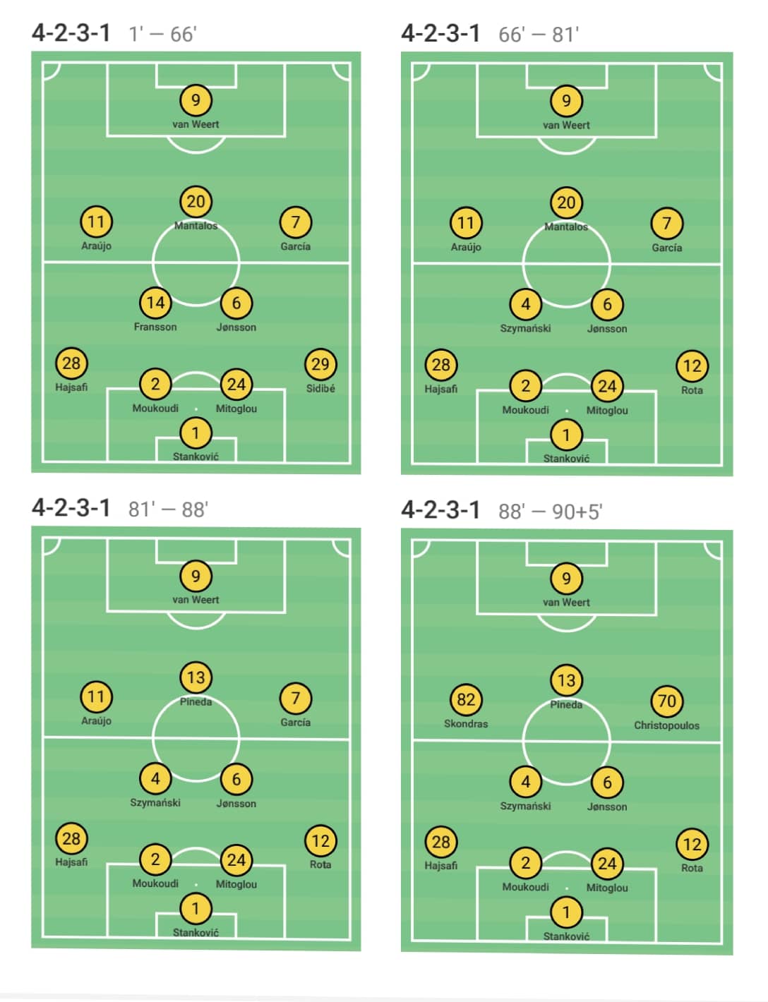 Ο Ματίας Αλμέιδα ξεκίνησε με διάταξη 4-2-3-1, με τους Γιόνσον και Φράνσον θεωρητικά σαν 6άρια τον Μάνταλο σε θέση 10, τον Γκαρσία στο δεξί άκρο της επίθεσης, και τον Αραούχο στο αριστερό. Αυτά όμως θεωρικά.