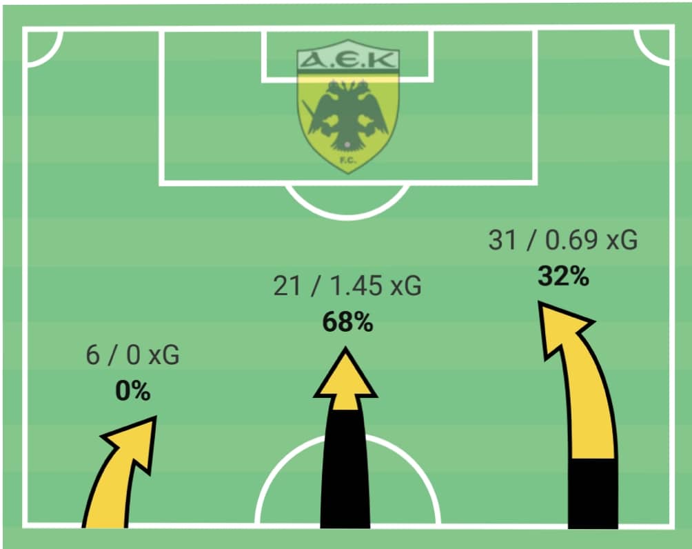 Στην ποιότητα των επιθέσεων και στα xG, παρατηρούμε οτι η ΑΕΚ βάσει αριθμών θα έπρεπε να έχει πετύχει τουλάχιστον ακόμη ένα γκόλ με το ποσοστό των xG να φτάνει στο 2,13 με εκφραστές τους Λιβάι Γκαρσία τον Πέτρο Μάνταλο και τον Τομ Φαν βερτ κυριώς για το πέναλτι γκόλ που πέτυχε.