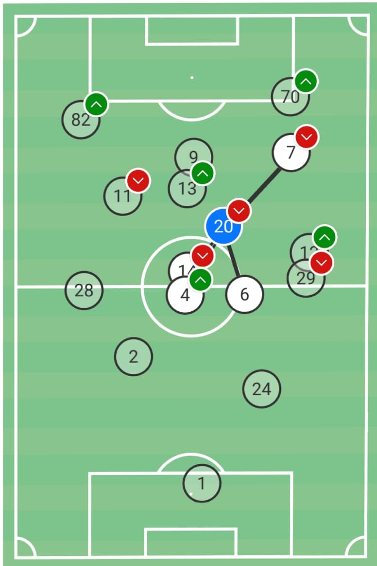 Στην πραγματικότητα ο Γιόνσον κινούνταν μόνος του σε θέση 6, ο Φράνσον λίγο πιό μπροστά του κάτι μεταξύ 6 και 8, αν και σε αρκετές περιπτώσεις άλλαζαν μεταξυ τους θέσεις, ο Μάνταλος κατι μεταξύ 8 και 10, αλλα επίσης σε αρκετές περιπτώσεις τραβιόταν πότε αριστερα ποτε δεξία για να βρεί κενούς χώρους και να δημιουργήσει, ο Λιβάι Γκαρσία στην ουσία ήταν το μοναδικό εξτρέμ που έδινε πλάτος στο γήπεδο απο δεξία, αλλα πατώντας πολύ μέσα στη περιοχή, και ο Αραούχο στο γνωστό του παιχνίδι, βρισκόταν περισσότερο στον άξονα παρά στο αριστερό άκρο της επίθεσης και σε κάποιες περιπτώσεις προσπαθούσε να πλαισιώσει τον Φαν βέρτ που ήταν ο μοναδικός κλασσικός επιθετικός.