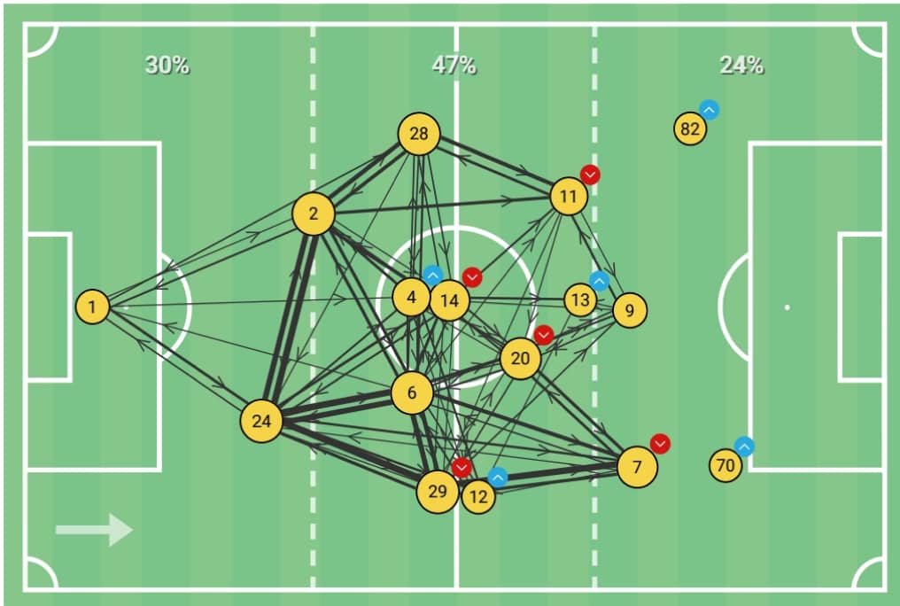 Η ακρίβεια στις μεταβιβάσεις κυμάνθηκε σε καλά ποσόστα άγγιξε το 87% με 583/667 μεταβιβάσεις. 82% στις προωθητικές πάσες με 82/100, 50% ποσοστό στις Smart passes με 4/8, 60% στις μεταβιβάσεις στην πλάτη της άμυνας με 9/15, και 32% στις σέντρες με 6/19.