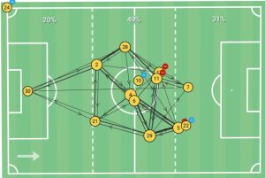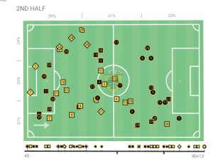 Και εδώ παρατηρούμε τις μεταβιβάσεις τόσο κοντινές αλλά και μακρινές σε πρώτο και δεύτερο ημίχρονο.
