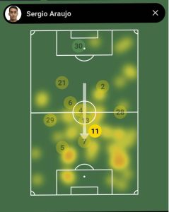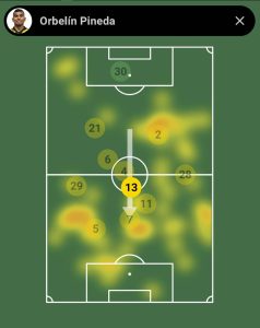Αραούχο και Πινέδα ήταν σχεδόν στους ίδιους χώρους που κινούνται πάντα από την αριστερή πλευρά δηλαδή, και ο Γιόνσον λίγο πιο ψηλά κάτι μεταξύ 6 και 8. Επίσης κάτι ακόμα που παρατηρούμε σε αυτό το γράφημα είναι ότι η Ένωση δεν έδωσε σχεδόν καθόλου πλάτος στο γήπεδο καθώς χρησιμοποίησε μόλις 36 m από αυτό.