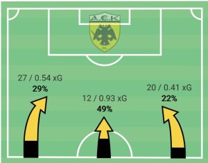 Οι ποιοτικότερες ευκαιρίες της ΑΕΚ ήρθαν για ακόμα ένα αγώνα από τον άξονα. Όπως βλέπετε 12 ευκαιρίες με 49% ποσοστό και 0,93 xG