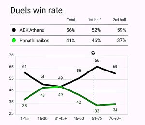 Η ΑΕΚ Κυριάρχησε και στις μονομαχίες όπως μπορούμε να δούμε στο κάτω γράφημα με 56% έναντι 41% του Παναθηναϊκού Και όπως μπορούμε να δούμε στο διάστημα από το 61 ως το 75 λεπτό και σχεδόν μέχρι και το τέλος του αγώνα έφτασε από 60% έως 66% τις κερδισμένες μονομαχίες.