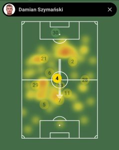 Χωρίς καμιά αμφιβολία ήταν ο καλύτερος παίκτης του γηπέδου και έδειξε το πόσο πολύ έλειψε από τον προηγούμενο αγώνα. Τα τρεξίματα του η ένταση και το πάθος που βγάζει είναι πραγματικά συγκλονιστικά. Έδωσε πάρα πολλές μάχες τόσο στη μεσαία γραμμή όσο και αμυντικά δίνοντας βοήθειες στον Σιντιμπέ όταν χρειαζόταν, όπως επίσης έκανε αρκετές φορές τριάδα ανάμεσα στα στόπερ για να βοηθήσει στη δημιουργία του παιχνιδιού . Κέρδισε πάρα πολλές μονομαχίες στο χώρο της μεσαίας γραμμής και όπως μπορούμε να δούμε στο χάρτη δράσης του Έτρεξε και κάλυψε πάρα πολλούς χώρους.
