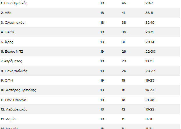 Αναλυτικά η βαθμολογία της Super League μετά τους αγώνες του Σαββάτου για την 19η αγωνιστική έχει ως εξής: