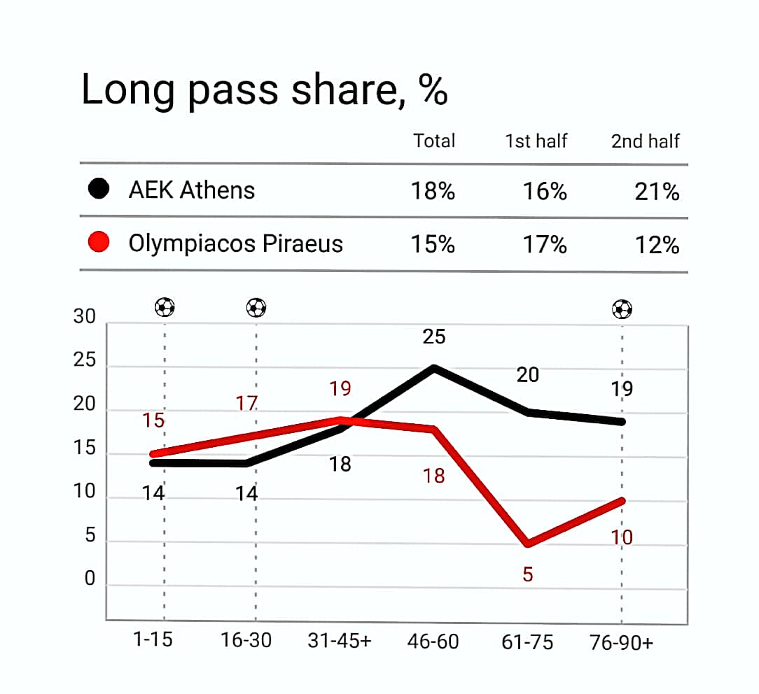 Ένας ακόμη λόγος που η κατοχή ήταν ελαφρώς προς την πλευρά του Ολυμπιακού, ήταν ότι η ΑΕΚ έχτιζε τις επιθέσεις της με μεγάλες μεταβιβάσεις από τα δύο της στόπερ, τον Μήτογλου και τον Τζαβέλλα.