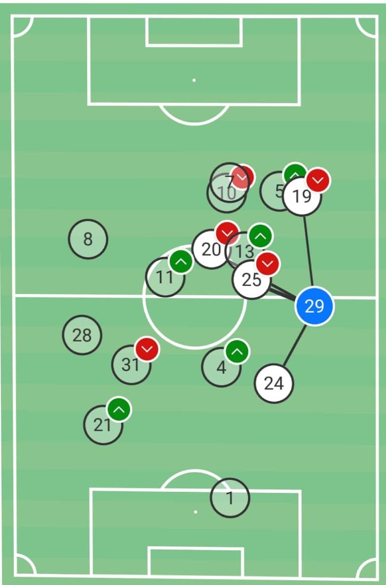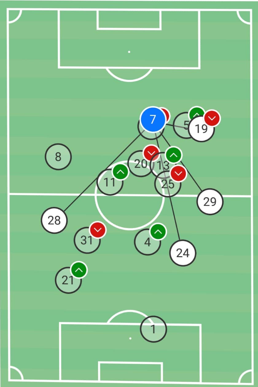 Όλοι οι υπόλοιποι παίκτες της μεσοεπιθετικής γραμμής κινήθηκαν στον άξονα και προς την δεξιά πτέρυγα όπως μπορούμε να παρατηρήσουμε, από τον Γαλανόπουλο και τον Μάνταλο, μέχρι τον