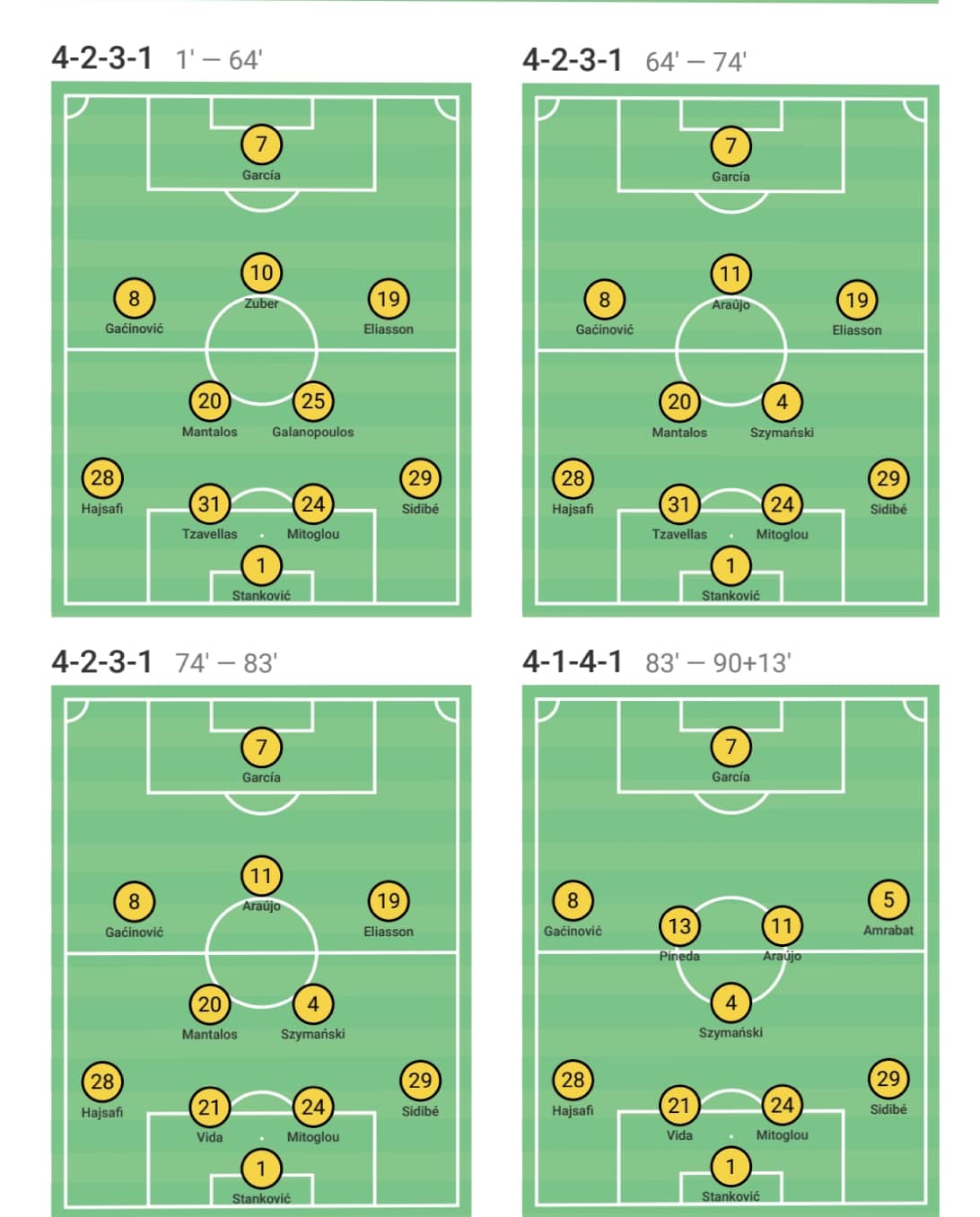 Τσούμπερ και τον Ελίασον που έδινε περισσότερο πλάτος από ότι ο Γκατσίνοβιτς από την απέναντι πτέρυγα. Ακόμη και οι αλλαγές ο Πινέδα με τον Άμπραμπατ κινήθηκαν προς την δεξιά πλευρά.