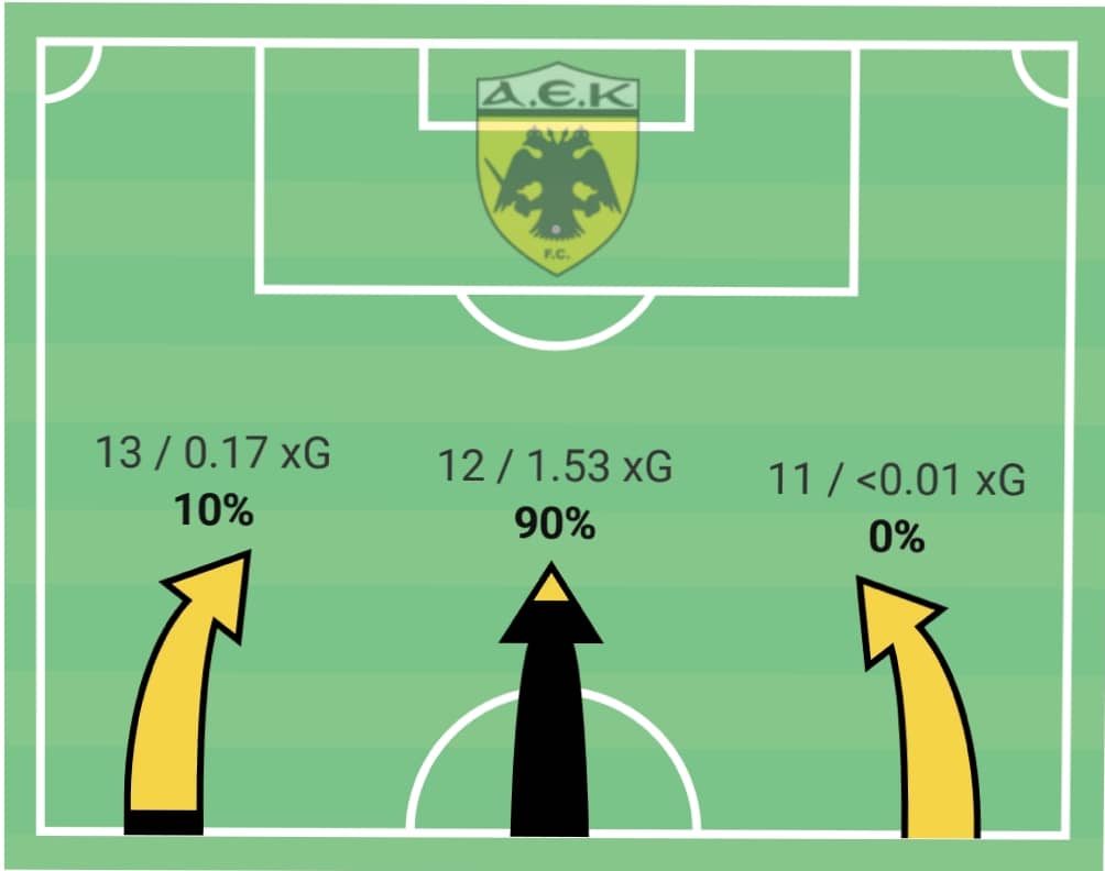Σε σύνολο 12 επιθέσεων και με ποσοστό 90% , ο δείκτης των xG ήταν στο 1,53, μόλις 10% ποιότητα επιθέσεων από την αριστερή πτέρυγα με 13 μεν επιθέσεις αλλά με δείκτη xG στο 0,17, και με 11 επιθέσεις από δεξιά με μηδενικό ποσοστό ποιοτικών ευκαιριών.