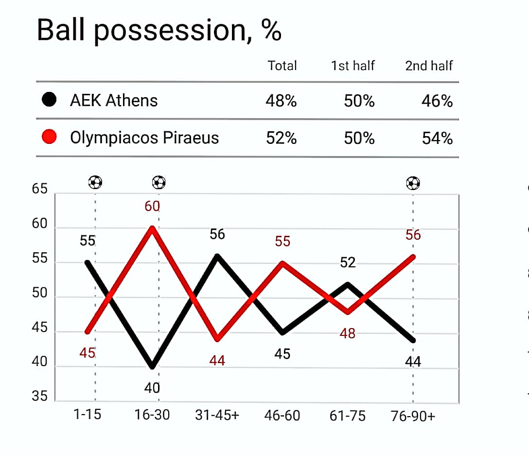 Αν ρίξουμε μια ματιά στην κατοχή, θα διαπιστώσουμε ότι ο Ολυμπιακός στο σύνολο είχε μια ελαφρά υπεροχή υπέρ του, η οποία όμως κατοχή από μόνη της όπως έχουμε γράψει και στο παρελθόν, δεν λέει κάτι. Συνειδητά η ΑΕΚ έδωσε την μπάλα στον Ολυμπιακό έχοντας από νωρίς το 1-0, έκανε διαχείριση του παιχνιδιού και το πήγε εκεί που ήθελε εκείνη.