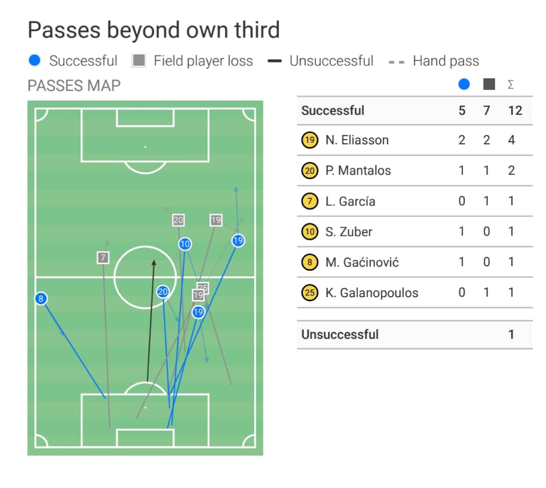Όπως παρατηρούμε και στο κάτω γράφημα, ειδικά σε όλο το δεύτερο ημίχρονο , οι κιτρινόμαυροι, προσπαθούσαν να βρουν με αυτές τις μεγάλες μεταβίβασες κυρίως τον Λιβάι Γκαρσία αλλά και τους Τσούμπερ και Ελίασον. Είναι ένας τρόπος παιχνιδιού, που δεν τον επιλέγει συχνά ο Ματίας Αλμέιδα, προτιμώντας συνήθως να χτίζει επιθέσεις με τον εκάστοτε αμυντικό χαφ, και συνήθως με μικρές μεταβιβάσεις είτε από τον άξονα είτε από τις πτέρυγες και με τις συνεχείς εναλλαγές θέσεων, των ακραίων με τους εσωτερικούς μέσους να προσπαθεί να διασπάσει την αντίπαλη άμυνα.