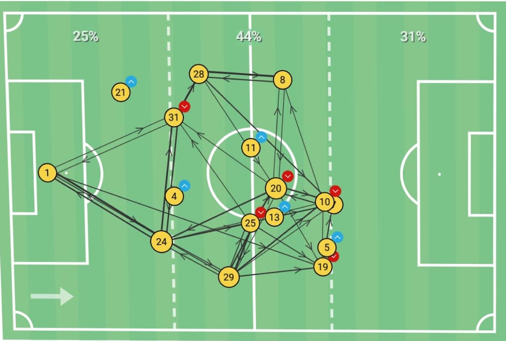 Ακόμη ένα χαρακτηριστικό γράφημα με τις μεγάλες μεταβιβάσεις από το αμυντικό τρίτο προς τους παίκτες που αναφέρθηκαν πιο πάνω.