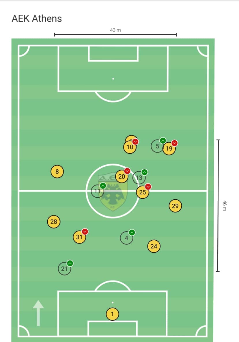 Η ΑΕΚ άρχισε τον αγώνα με σχηματισμό 4-2-3-1, με Γαλανόπουλο σε θέση 6 τον Μάνταλο να βρίσκεται σε θέση 8 λίγο πιο ψηλά, τον Τσούμπερ σε θέση 10 πίσω από τον μοναδικό προωθημένο Λιβάι Γκαρσία, και τους Γκατσίνοβιτς στην αριστερή πτέρυγα και τον Ελίασον στην δεξιά. Από το 83′ και μέχρι και το τέλους του παιχνιδιού η διάταξη γύρισε σε 4-1-4-1,και με τις αλλαγές προσώπων να βρίσκει τους Αραούχο και Πινέδα σε θέση 8 εσωτερικών μέσων, τον Σιμάνσκι σε θέση 6, και τον Άμπραμπατ αντί του Ελίασον στην δεξιά πτέρυγα.