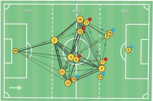 Στο γράφημα με τις μεταβιβάσεις αυτό που παρατηρούμε είναι ότι ο Φαν Βεέρτ μπαίνοντας στο παιχνίδι στο 80′ και αγωνιζόμενος μαζί με τις καθυστερήσεις για 17′, δεν πήρε ούτε μία μεταβίβαση από συμπαίκτη του, αν και αγωνιζόμενος μέσα στην περιοχή και τα 17 ‘.