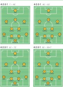 Η διάταξη δεν άλλαξε ακόμη και μετά από τις αλλαγές από το 72′ και μετά, παρά μόνο τα πρόσωπα. Ο Γκατσίνοβιτς αντί του Γιόνσον μεταφέροντας πιο χαμηλά τον Πινέδα και από το 80′ τον Ελίασον αντί του Πινέδα, ο οποίος πήγε να παίξει εκεί που έπαιζε ο Άμπραμπατ στα δεξιά, ήρθε ο Γκατσίνοβιτς πιο χαμηλά, ο Μαροκινός έπαιξε αριστερά, ο Τσούμπερ αντί του Αραούχο, ο Φαν Βεέρτ αντί του Γκαρσία και ο Σιντιμπέ αντί του Ρότα.