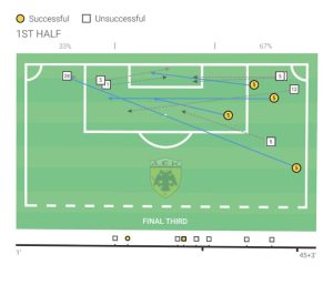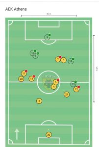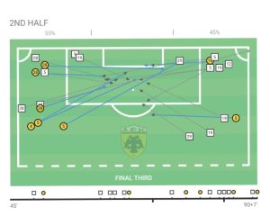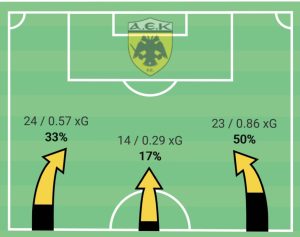 Όπως επισημάναμε και στην αρχή ο άξονας της ΑΕΚ δεν δούλεψε σωστά, και αυτό το παρατηρούμε στο κάτω γράφημα με τις επιθέσεις, όπου οι ποιοτικότερες εξ αυτών έγιναν από τα άκρα με 24 επιθέσεις από αριστερά με 33% ποσοστό και 0,57xG, και από δεξιά 23 επιθέσεις με 50% ποσοστό και με 0,86 xG.