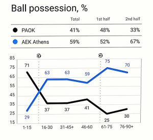 Το γράφημα με την κατοχή μπάλας μας δείχνει δύο στοιχεία. Το πρώτο το πόσο άσχημα άρχισε το παιχνίδι η Ένωση, βλέποντας ότι στο πρώτο τέταρτο η κατοχή ήταν στο 71% – 29% υπέρ του ΠΑΟΚ και αμέσως μετά από το πρώτο γκολ, η ΑΕΚ πήρε την κατοχή δεν την έχασε μέχρι και το τέλους του παιχνιδιού, αλλά -και εδώ παρατηρούμε το δεύτερο στοιχείο- ότι η κατοχή από μόνης της χωρίς την ανάλογη παραγωγή φάσεων δεν λέει απολύτως τίποτα. Οι κιτρινόμαυροι είχαν μια ανούσια κατοχή η οποία στο δεύτερο μέρος έφτασε το 75% – 25% στο τέταρτο 61′ – 75′.