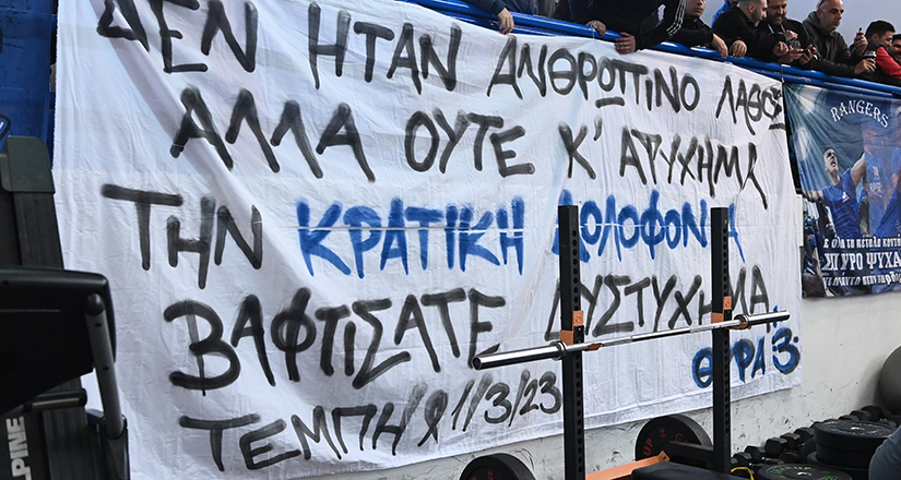 Δεν ξεκίνησε στις 17:00 η αναμέτρηση, καθώς σηκώθηκε πανό από τους γηπεδούχους οπαδούς για την τραγωδία στα Τέμπη.