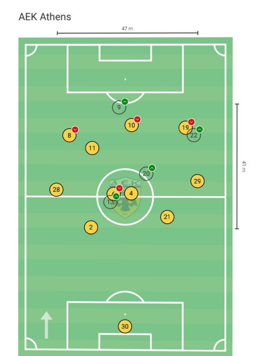 να συγκλίνουν περισσότερο στον άξονα και να δίνει χώρο στο αριστερό μπακ (Χατζησαφί η Μοχαμάντι) να ανεβαίνει σε όλη την πλευρά και να γίνεται εξτρέμ, σαν να παίζει με τρείς στην άμυνα και τα μπακ να παίρνουν όλη την πλευρά. Ο προπονητής της ΑΕΚ βασίζει πολύ το παιχνίδι του στα άκρα, για αυτό και στο ξεκίνημα της χρόνιας άρχιζε τα παιχνίδια με σχηματισμό 3-5-2 το οποίο όμως δεν έδειξε να λειτουργεί και πολύ καλά, γι’ αυτό και γρήγορα σχετικά το άλλαξε.