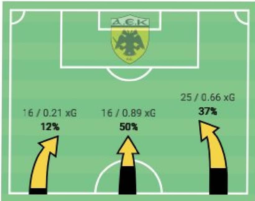Σε ακόμη ένα παιχνίδι η ΑΕΚ προσπάθησε να εκμεταλλευτεί και τα άκρα της αλλά και τον άξονα. 16 επιθέσεις έγιναν και από την αριστερή πλευρά αλλά και από τον άξονα με την διαφορά όμως να εντοπίζεται στην ποιότητα των ευκαιριών. Από τον άξονα ήταν το 50% των ποιοτικότερων επιθέσεων με τον δείκτη των xG να φτάνει στο 0,89.