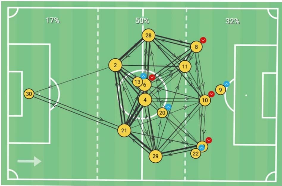 Και το γράφημα με τις μεταβιβάσεις του, όπου μπορούμε να παρατηρήσουμε ότι οι πίσω μεταβιβάσεις του είναι ελάχιστες, και ότι δεν δίσταζε να δοκιμάσει να παίξει με μεγάλες μεταβιβάσεις, όπως επίσης ότι έπαιξε αρκετά κάθετα κυρίως με τον Ελίασον.