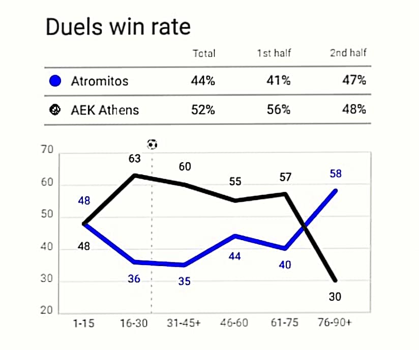 Ακόμη ένας τομέας που υπερίσχυσε η ΑΕΚ είναι η μονομαχίες. Όπως παρατηρούμε και στον κάτω πίνακα, από το 16 ‘έως και το 75’ η ΑΕΚ κέρδιζε συνεχώς τις μονομαχίες και μόνο στο τελευταίο