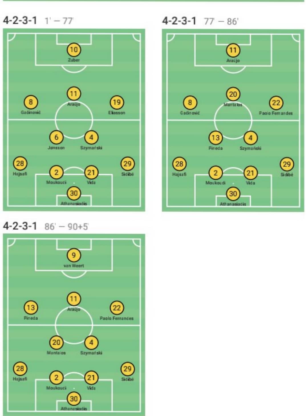 Ο Ματίας Αλμέιδα επανήλθε στο 4-2-3-1 με Σιμάνσκι και Γιόνσον σε θέση 6, με τον Γιόνσον συχνά όμως να κινείται πιο ψηλά από τον Πολωνό, τον Ελίασον σε θέση δεξιού εξτρέμ , τον Γκατσίνοβιτς από αριστερά τον Αραούχο πίσω από τον Τσούμπερ που ήταν ο μοναδικός προωθημένος. Η διάταξη δεν άλλαξε και μετά τις αλλαγές, με τον Πινέδα να πηγαίνει στην αρχή δίπλα στον Σιμάνσκι και αργότερα αριστερά αντί του Γκατσίνοβιτς, τον Φερνάντες δεξιά αντί του Ελίασον, τον Μάνταλο στην αρχή σε θέση 10 και μετά στα χαφ στην θέση του Γιόνσον, και τον Φαν Βεέρτ στην κορυφή της επίθεσης αντί του Τσούμπερ, θέση που έπαιξε για 9 περίπου λεπτά και ο Αραούχο μέχρι να μπει στο παιχνίδι ο Ολλανδός.