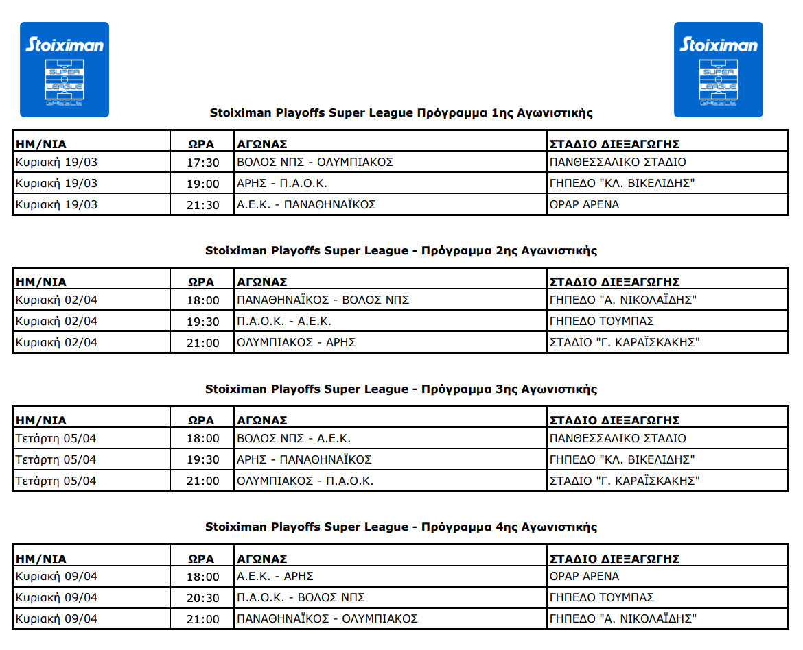 Όπως αναμενόταν, χθες έγιναν γνωστές οι τελικές ημέρες και ώρες διεξαγωγής των αγώνων των play-off, στην πρεμιέρα των οποίων η ΑΕΚ αντιμετωπίζει τον ΠΑΟ.