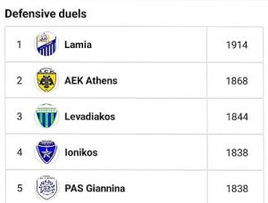 Στην επόμενη κατηγορία βρίσκουμε τις αμυντικές μονομαχίες. Στην πρώτη πεντάδα υπάρχουν 4 ομάδες από τα χαμηλά στρώματα της βαθμολογίας και την ΑΕΚ στην δεύτερη θέση. Αυτό προκύπτει από τον τρόπο που αμύνεται η Ένωση και το high press που ασκεί από το επιθετικό της τρίτο. Η οργανωμένη άμυνα της ΑΕΚ ξεκινάει ψηλά στο γήπεδο και η δεύτερη θέση προκύπτει από τις πολλές ανακτήσεις μπάλας που πετυχαίνει με αυτόν τον τρόπο.