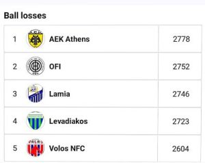 Στο ίδιο σκεπτικό και η επόμενη κατηγορία με τις απώλειες μπάλας. Oι πολλές επιθέσεις των κιτρινόμαυρων συχνά οδηγούν και σε πολλές απώλειες της μπάλας. Στην πρώτη θέση και εδώ η ΑΕΚ.