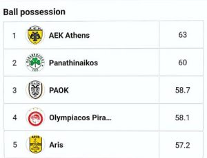 Επόμενη κατηγορία αφορά το ποσοστό κατοχής μπάλας, όπου είναι και εκεί στην πρώτη θέση με 63%, με δεύτερο τον Παναθηναϊκό με 60%.