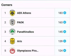 Επόμενη κατηγορία τα κόρνερ όπου και εκεί η ΑΕΚ βρίσκεται στην πρώτη θέση με 183 με τον ΠΑΟΚ να έρχεται δεύτερος με 163.