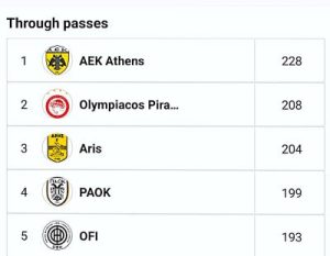 Πρώτη υποκατηγορία οι μεταβιβάσεις στην πλάτη της άμυνας. Στην πρώτη θέση και εδώ με 228 με τον Ολυμπιακό να ακολουθεί με 208.