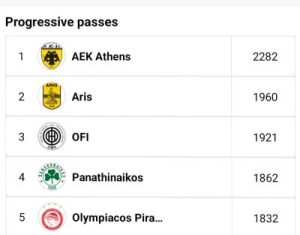 Key passes. Πάσες κλειδιά που θα μπορούσε να είναι και ασίστ. Ακόμη μία πρωτιά για την ΑΕΚ με 125 και στην δεύτερη θέση τον ΠΑΟΚ με 116.