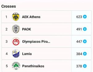 Στην κατηγορία με τις σέντρες υπάρχει τεράστια διαφορά με τον δεύτερο ΠΑΟΚ με 623 έναντι 491.