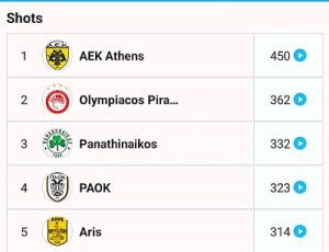 Επόμενη κατηγορία τα σουτ. Ακόμη μία πρώτη θέση για την ΑΕΚ με 450 σουτ και με μεγάλη διαφορά από τον δεύτερο Ολυμπιακό που είχε 362.