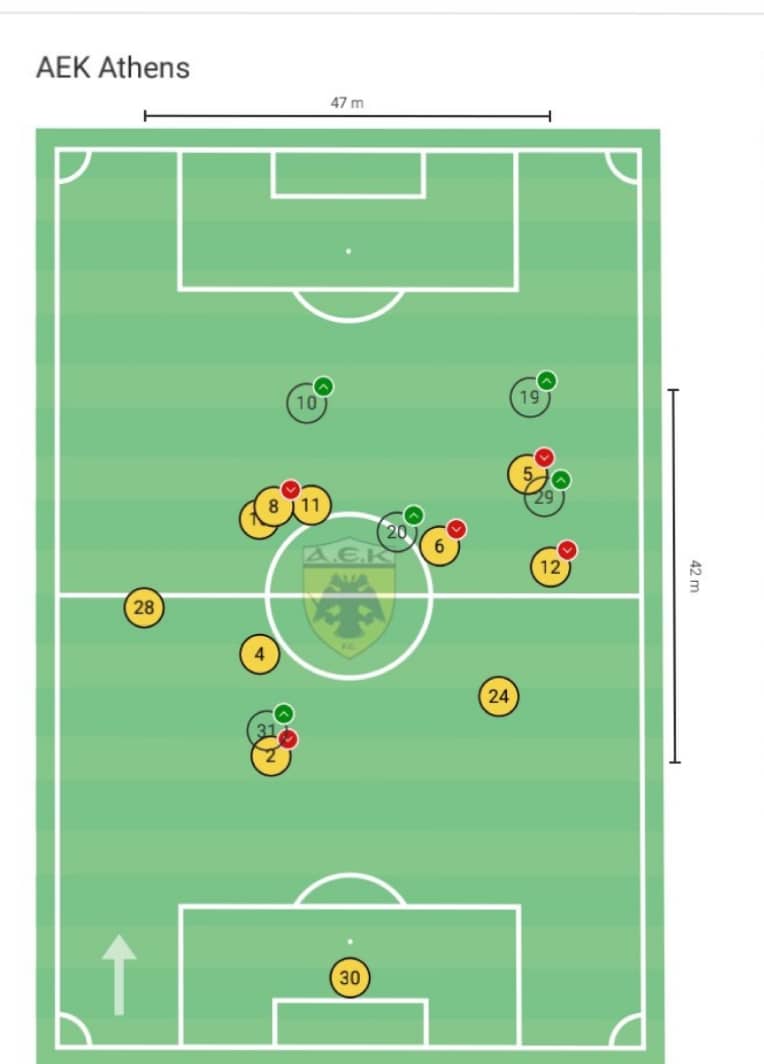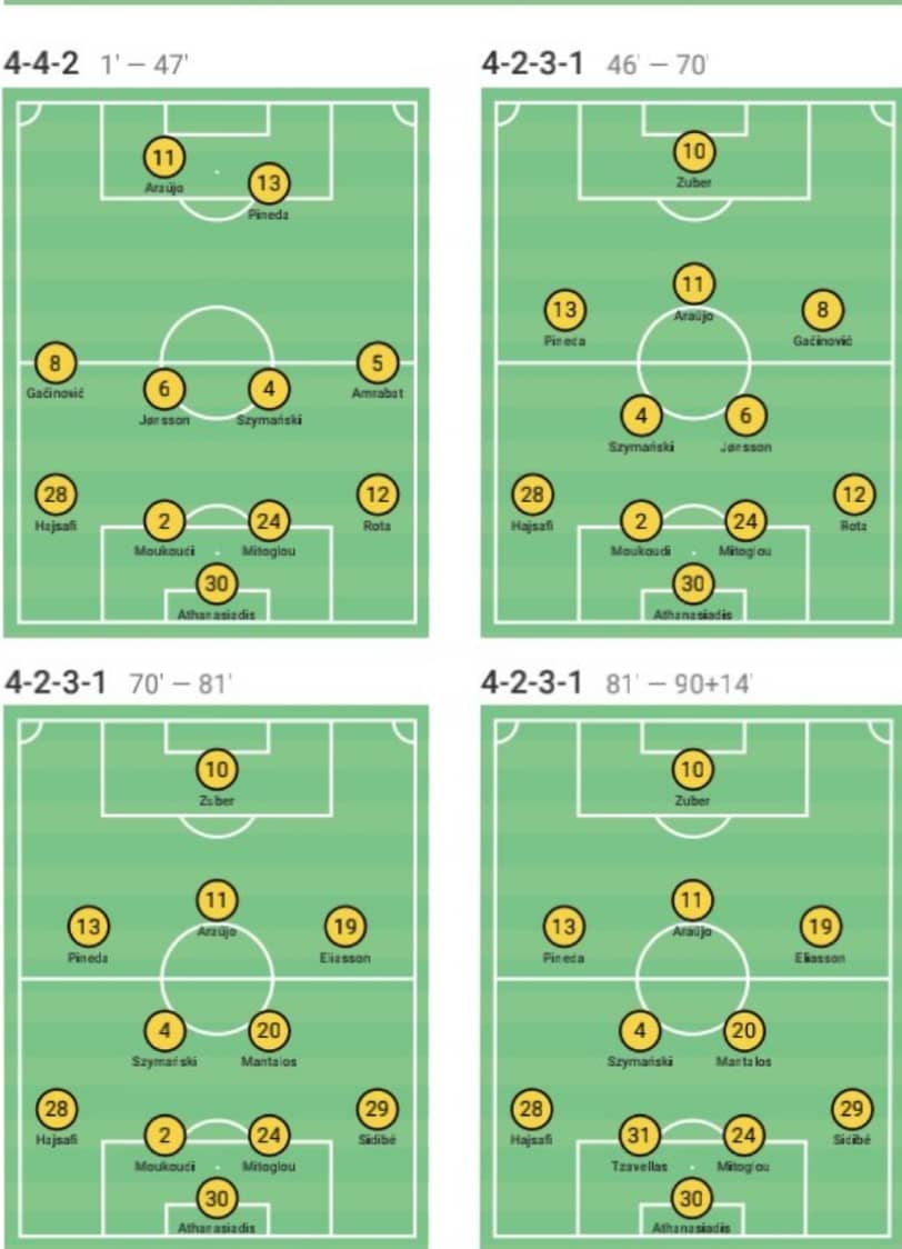 Η ΑΕΚ άρχισε με 4-4-2 και πήγε με αυτόν τον σχηματισμό σε όλο το πρώτο ημίχρονο.Με Γίονσον Σιμάνσκί στο 6, τον Γκατσίνοβιτς αριστερά, τον Άμπραμπατ δεξιά, και επιθετικό δίδυμο τους Πινέδα και Αραούχο. Στο ξεκίνημα του δευτέρου ημιχρόνου με την είσοδο του Τσούμπερ αντί του Άμπραμπατ, ο Ελβετός πήγε μόνος του στην κορυφή της επίθεσης η διάταξη άλλαξε σε 4-2-3-1, ο Αραούχο ήρθε πίσω απο τον Τσούμπερ, ο Πινέδα πήγε αριστερά και ο Γκατσίνοβιτς δεξιά. Έτσι πήγε μέχρι το τέλος και οι όποιες αλλαγές έγιναν, ήταν μόνο σε αλλαγές προσώπων, ο Ελίασον στην θέση του Γκατσίνοβιτς, ο Μάνταλος στην θέση του Γίονσον και ο Σιντιμπέ στην θέση του Ρότα.