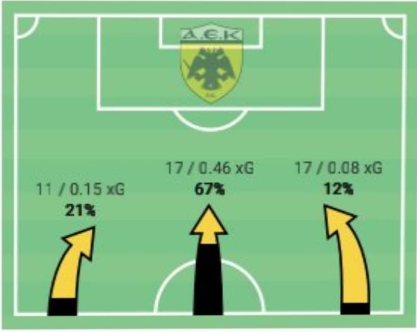 Σχετικά με την ποιότητα των επιθέσεων γράψαμε και πιο πριν ότι τα xG της ΑΕΚ ήταν πολύ χαμηλά και το κάτω γράφημα απλά μας δείχνει ότι από τον άξονα δημιουργήθηκαν οι ποιοτικότερες ευκαιρίες , 17 τον αριθμό και με τα xG να φτάνουν στο 0,46.