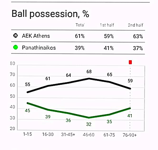 Βάζω αυτόν τον πίνακα, για να δείξω ακόμη μία φορά ότι η κατοχή μπάλας από μόνη της δεν δείχνει κάτι. Η ΑΕΚ είχε συντριπτικά την μπάλα στην κατοχή της με 61% έναντι 39% του αντιπάλου της καθ’ όλη την διάρκεια του παιχνιδιού, αλλά το μόνο που κατάφερε είναι απλά να γυρίζει με πολλές μεταβιβάσεις την μπάλα κυρίως στο μεσαίο τρίτο, χωρίς να δημιουργεί επικίνδυνες καταστάσεις προς την εστία του Παναθηναϊκού.