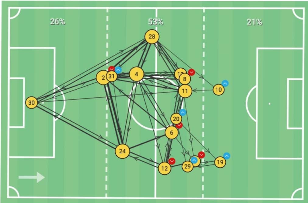 Στο γράφημα με το που κινήθηκαν οι παίκτες στο γήπεδο, παρατηρούμε ότι όλοι οι μεσοεπιθετικοί κινήθηκαν πολύ μακριά από την περιοχή. Μόνο οι Τσούμπερ και Ελίασον όταν πέρασαν στο παιχνίδι προσπάθησαν να κινηθούν πιο κοντά στην περιοχή του Παναθηναϊκού. Επίσης βλέπουμε ότι οι Αραούχο , Γκατσίνοβιτς και Πινέδα κινήθηκαν σχεδόν στους ίδιους χώρους, στον άξονα και αριστερά.