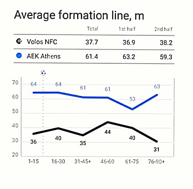 Στο κάτω γράφημα μπορούμε να δούμε το πόσο ψηλά βρίσκεται μια όμαδα στο γήπεδο. Σε αυτό το γράφημα επίσης μπορούμε να παρατηρήσουμε και το τακτικό πλάνο μίας ομάδας. Ο Βόλος καθ΄όλη την διάρκεια του παιχνιδιού βρισκόταν απο τακτική επιλογή σε χαμηλά μέτρα ακόμη και μετα απο το γκόλ που δέχθηκε. Κινηθηκε μέσο όρο σε 37,7 μέτρα σε αντίθεση με την ΑΕΚ που απο την αρχή του αγώνα βρισκόταν πολύ ψηλά στον αγωνιστικό χώρο με μέσο όρο 61,4 μέτρα.