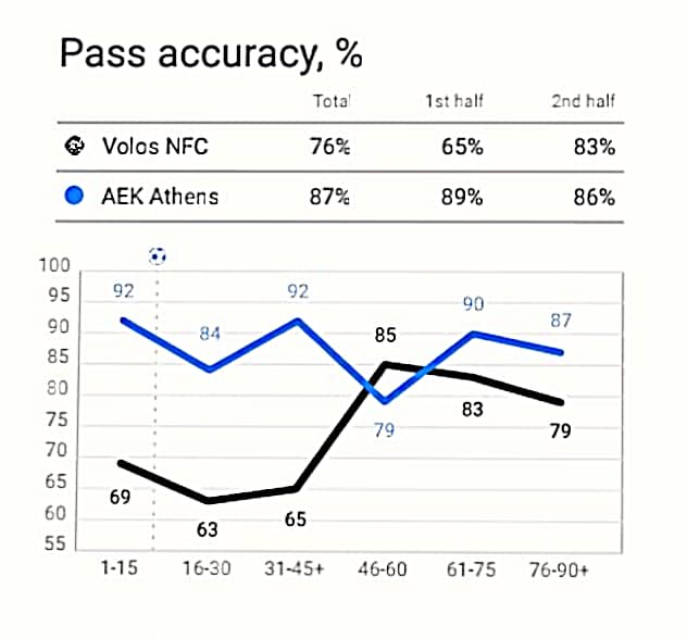 Ένας από τους λόγους που η ΑΕΚ κέρδισε το παιχνίδι, ήταν οι ακρίβεια στις μεταβιβάσεις. Οι κιτρινόμαυροι στο πρώτο ημίχρονο έφτασαν το ποσοστό τους στο 89% και συνολικά στο 87%. Πιο αναλυτικά είχε 561 στις 638 συνολικές μεταβιβάσεις, και 80% ακρίβεια στις προωθητικές μεταβιβάσεις με 53/66. Όταν μια ομάδα έχει μεγάλη ακρίβεια στις μεταβιβάσεις της, σημαίνει λιγότερες λάθος μεταβιβάσεις άρα μεγαλύτερη κατοχή μπάλας άρα δίνεις στον αντίπαλο πολύ λιγότερες ευκαιρίες στο να γίνει επικίνδυνος. Βασικό χαρακτηριστικό της φετινής ΑΕΚ.