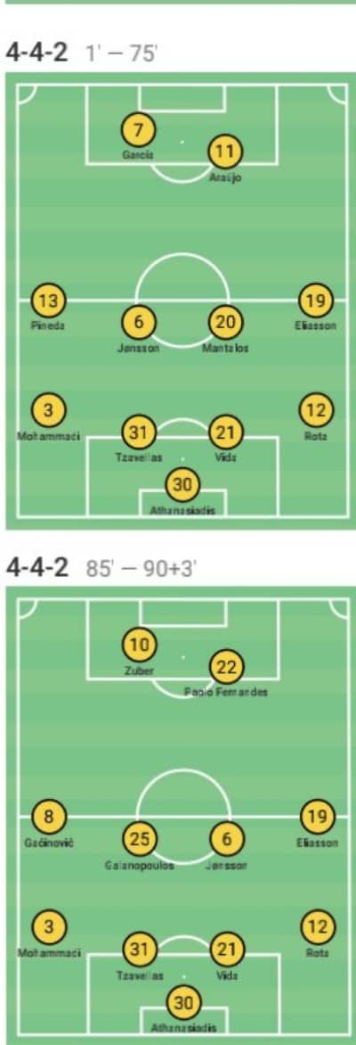 Σε σύγκριση με τον αγώνα με τον ΠΑΟΚ υπήρξαν 5 αλλαγές. Ο Ρότα αντί του Σιντιμπέ και ο Μοχαμάντι αντί του Χατζησαφί στην άμυνα, ο Μάνταλος αντί του Σιμάνσκι στην μεσαία γραμμή, ο Ελίασον αντί του Άμπραμπατ και ο Γκαρσία αντί του Γκατσίνοβιτς σαν πρόσωπο όχι σαν θέση.